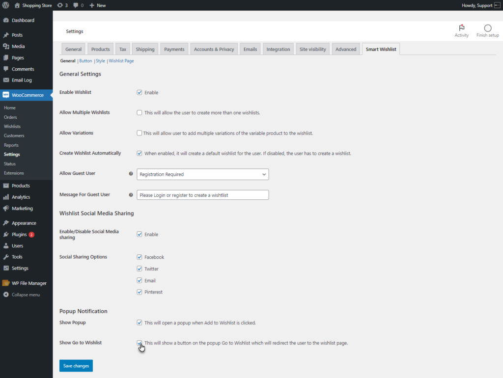 ↑ Back to topFor the general settings of the Wishlist, Go to WordPress Admin Dashboard > WooCommerce > Settings > Smart Wishlist.