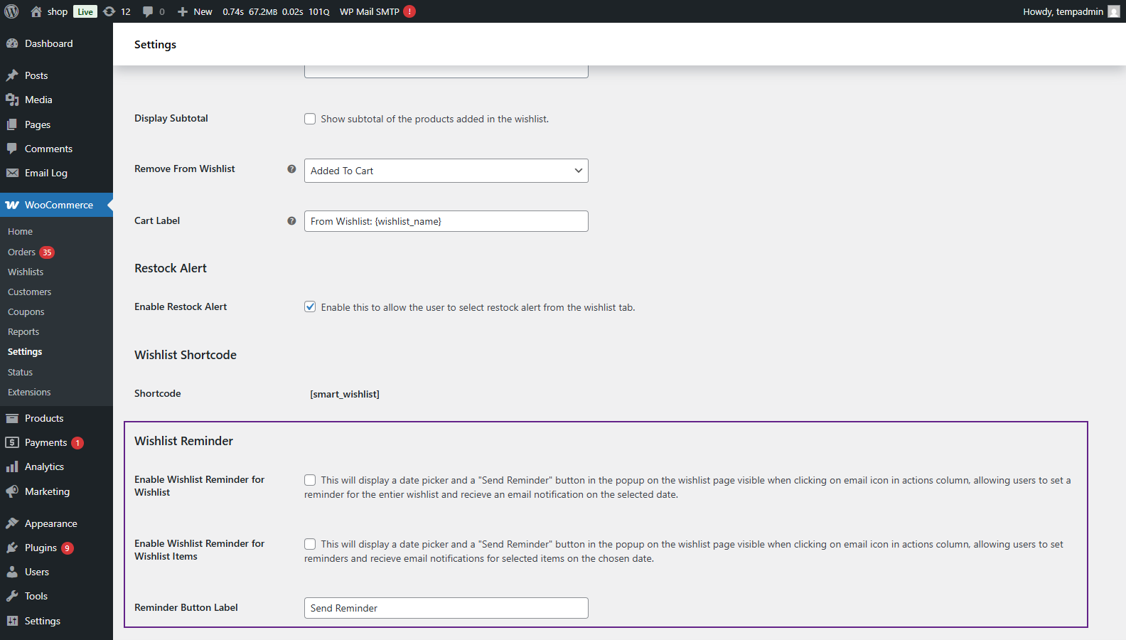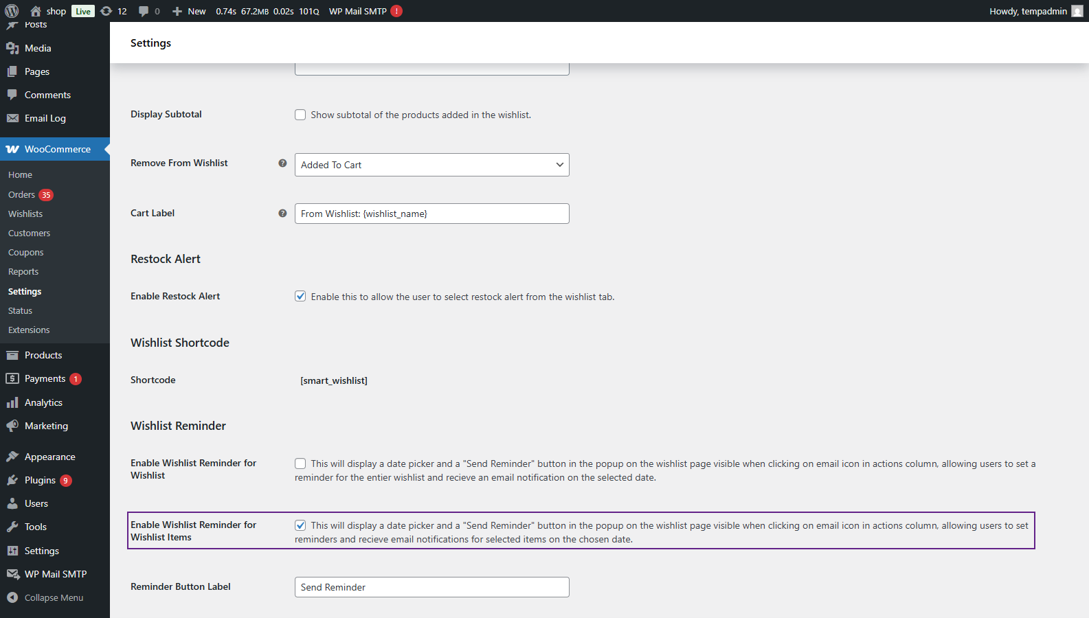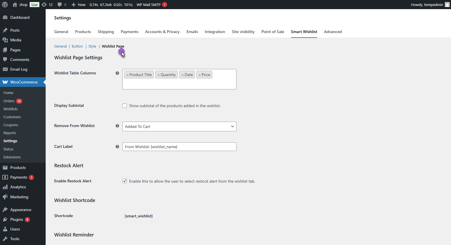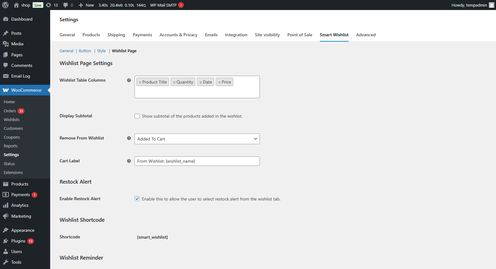 - WooCommerce > Settings > Smart Wishlist > General