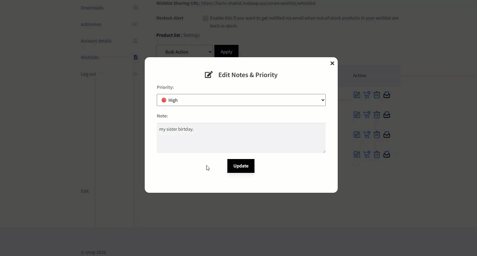 - Select the Shared option from the Wishlist Privacy. A shared URL will be generated and the user with the link can view the wishlist.