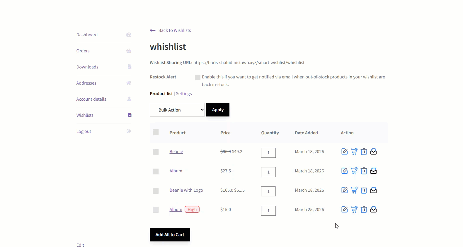 ↑ Back to topThe Smart Wishlist for WooCommerce extension enables customers to save products of interest to a wishlist, allowing them to track prices and availability. It also lets customers create multiple wishlists, set privacy settings, and share them with others. Products can be added to the cart directly from the wishlist. Additionally, the admin can customize the “Add to wishlist” button and view all wishlists in a single table.