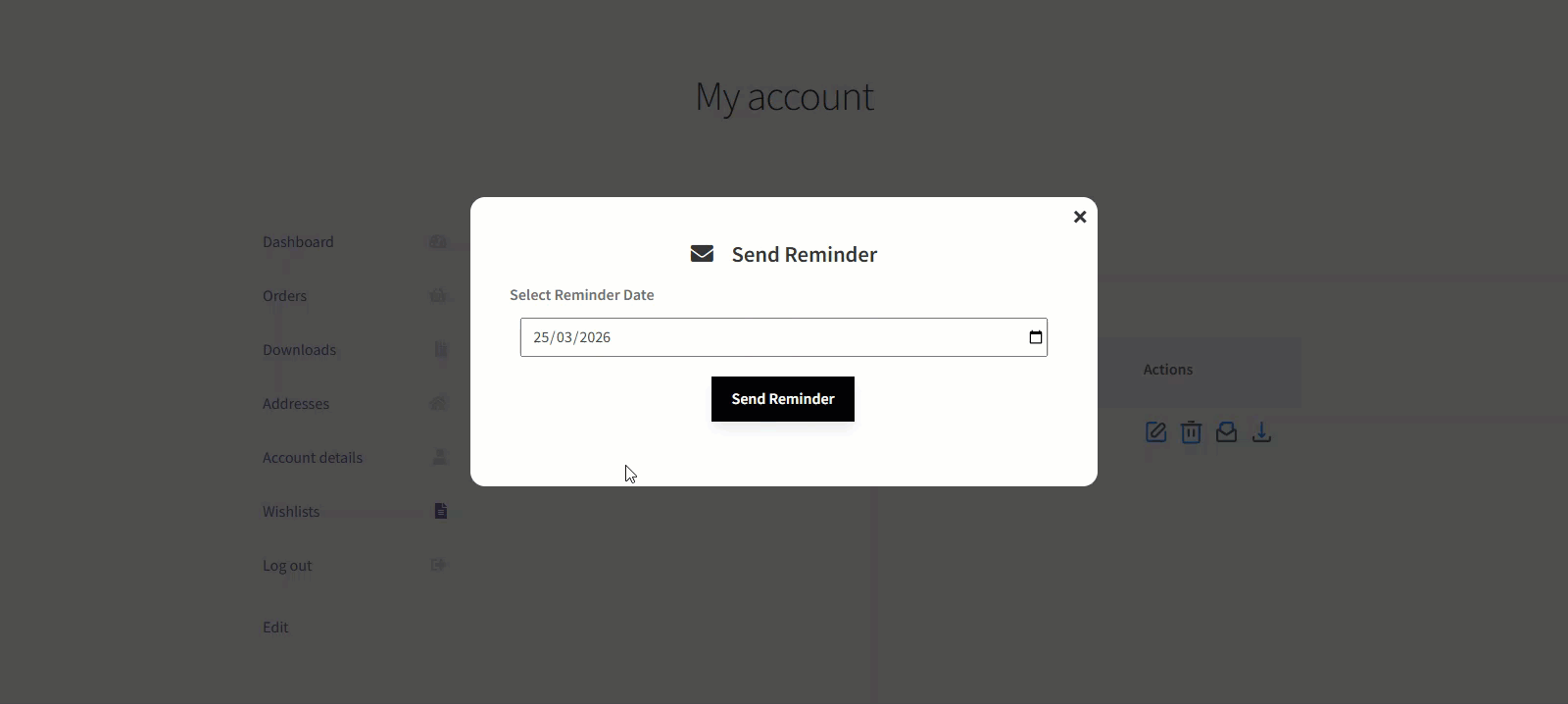 ↑ Back to topThis feature allows users to set reminders for their wishlists or individual items on their wishlists. On the selected date, the system automatically sends an email notification to the user containing the wishlist details.