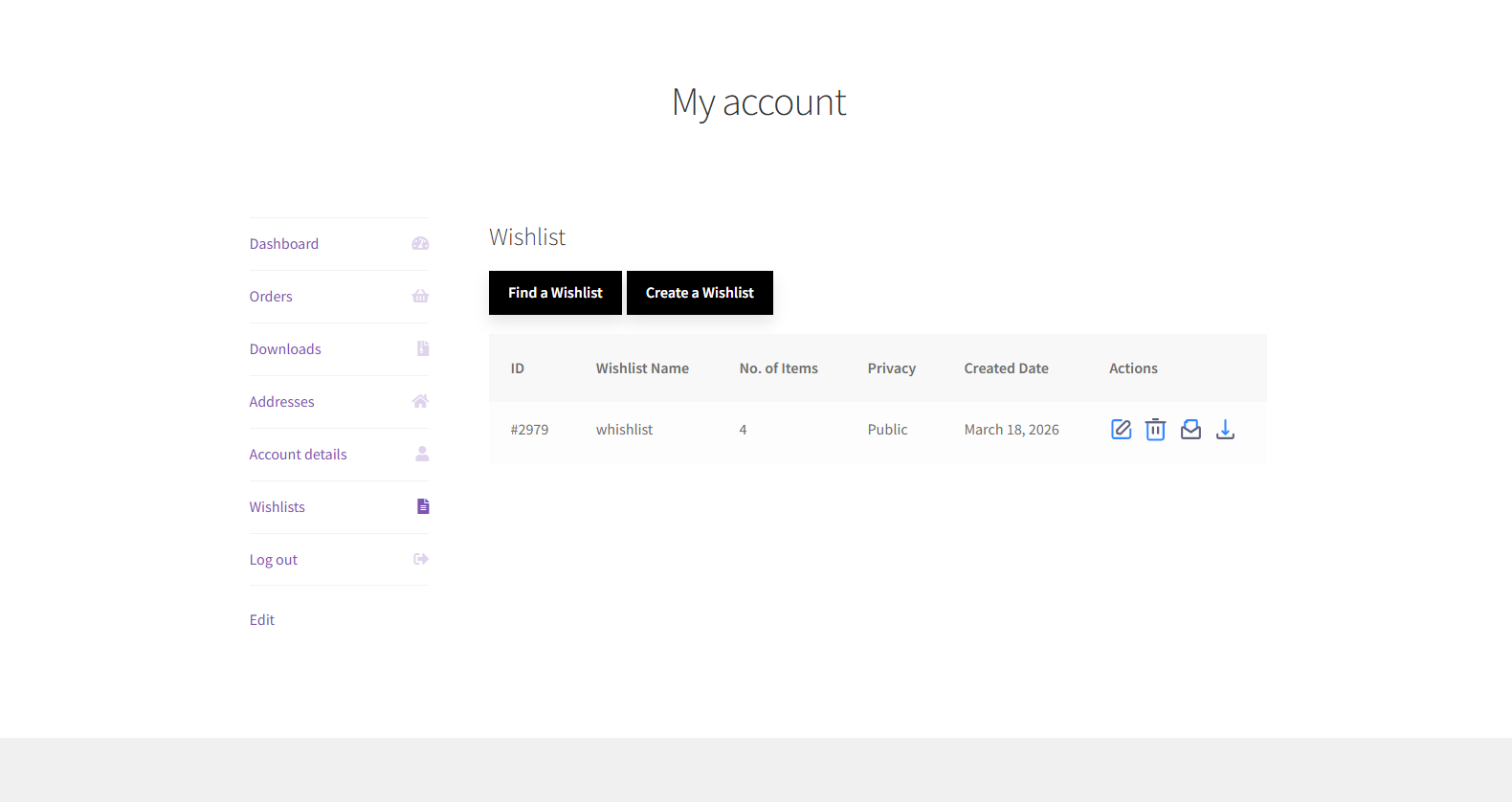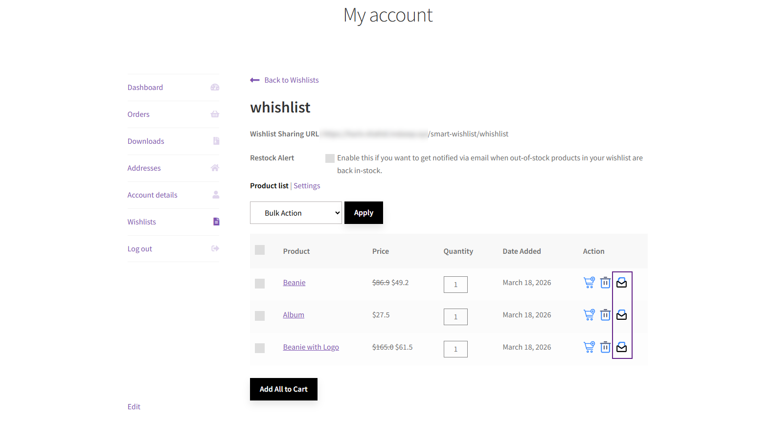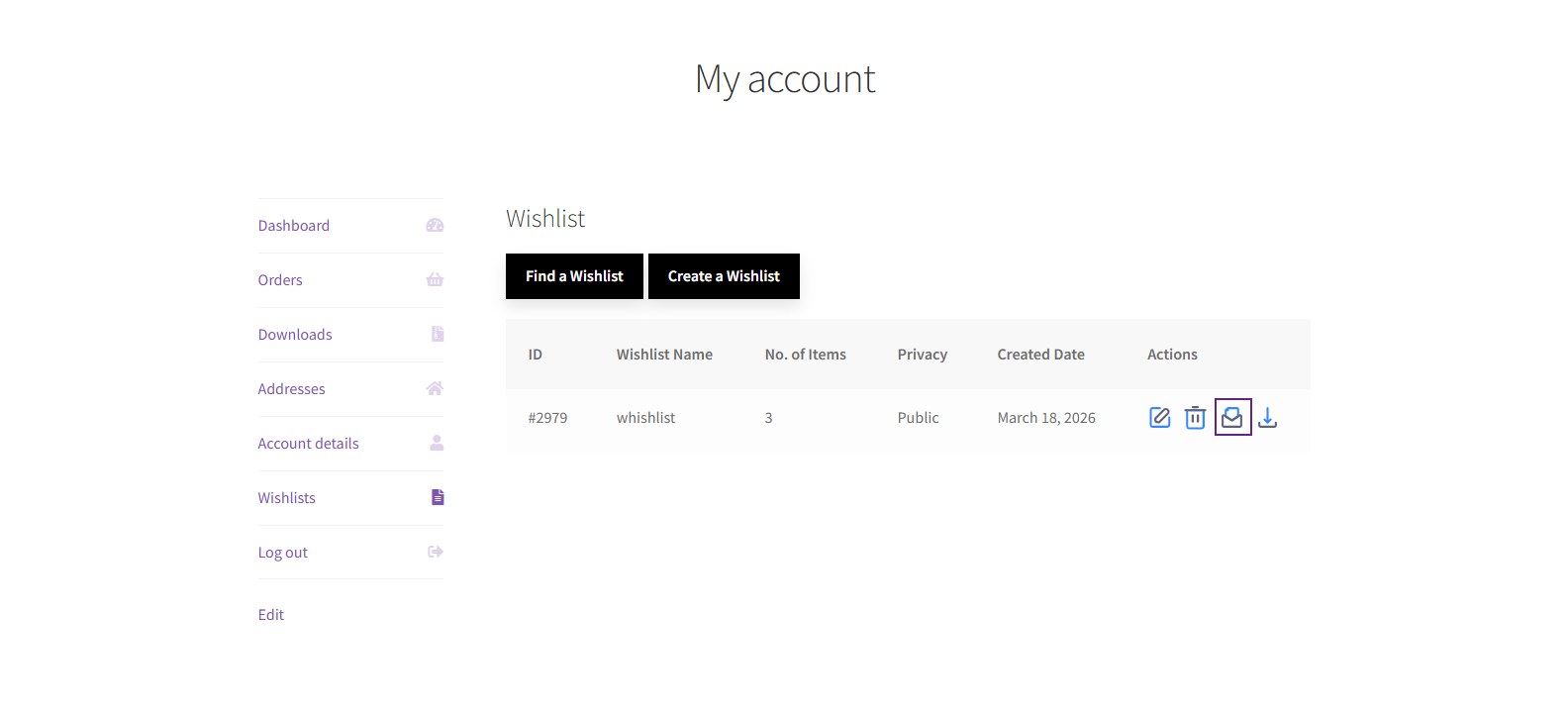 - Each wishlist item will have an Email icon in the Actions column.