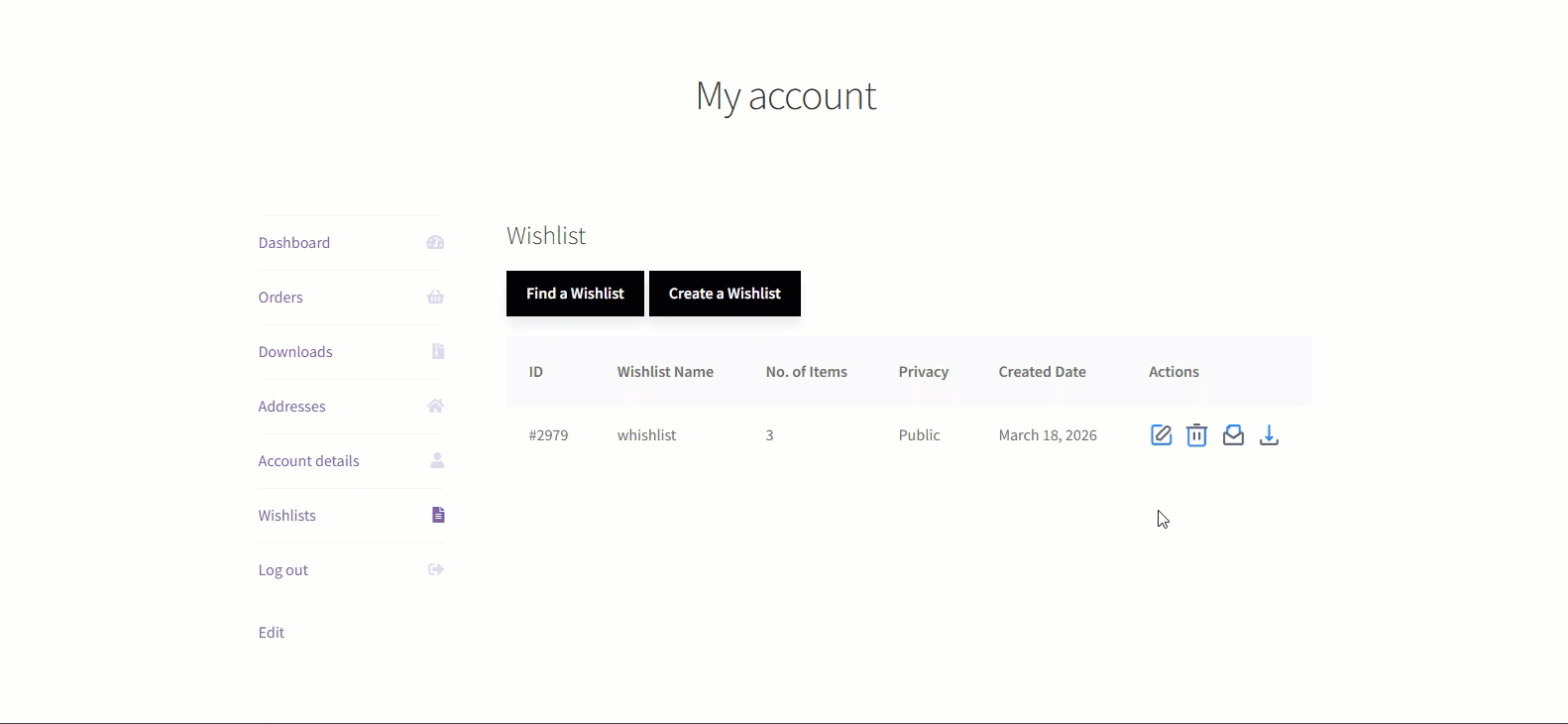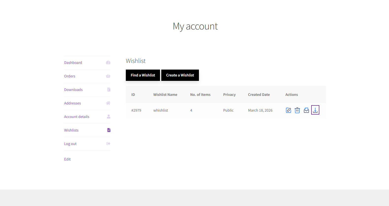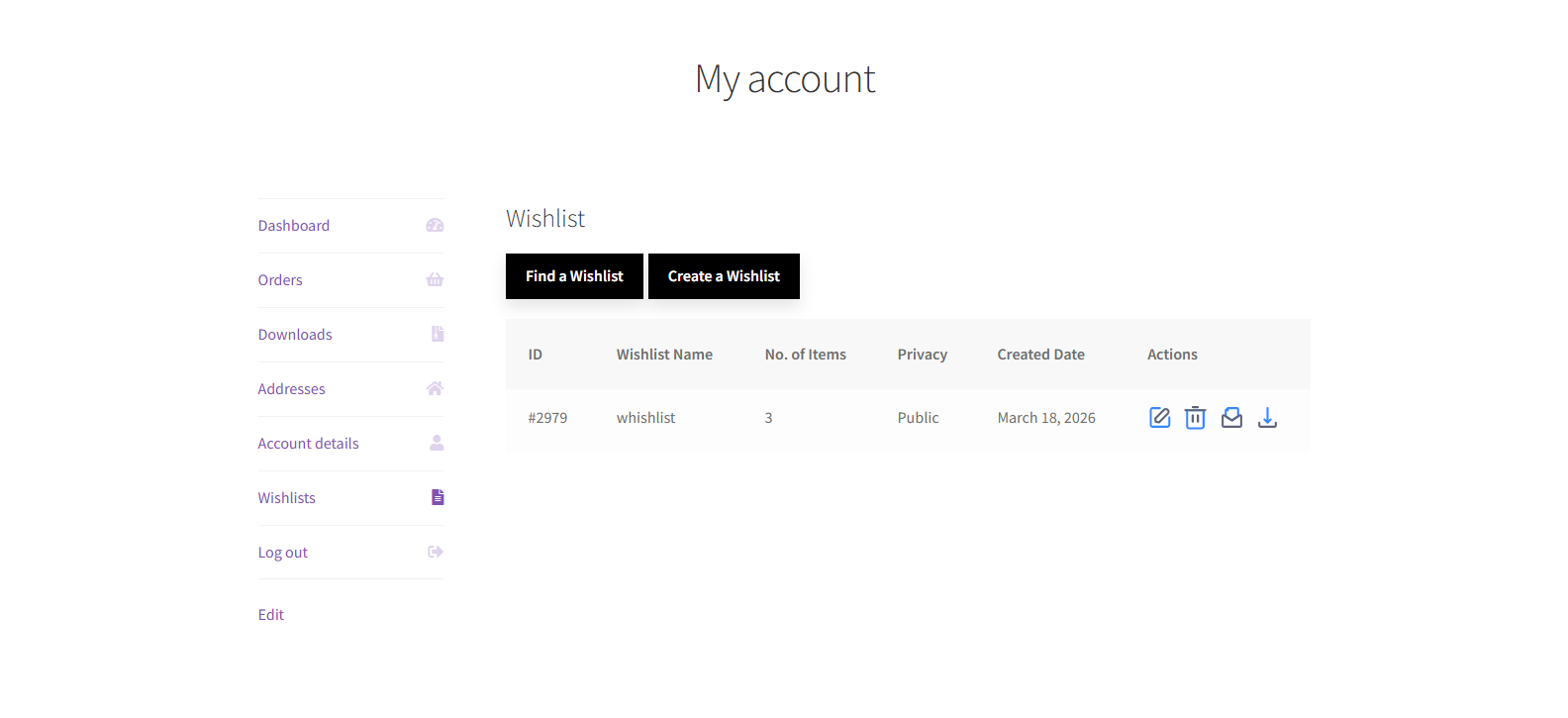 - Go to My Account → Wishlists tab.