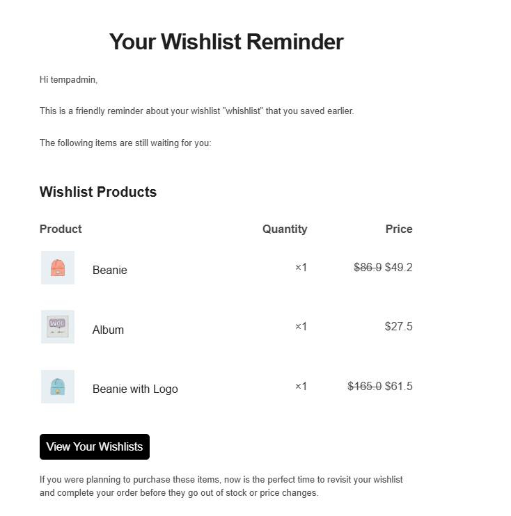 - The admin can customize the email subject line (e.g., “Reminder: Items Waiting in Your Wishlist”).