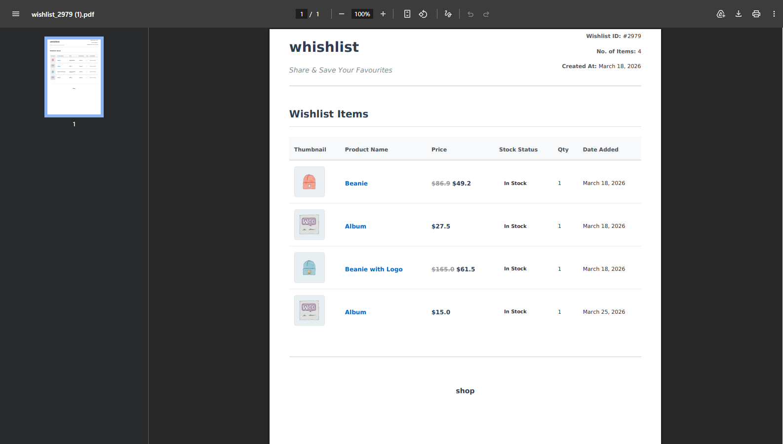 - A PDF file will be generated for that specific wishlist.