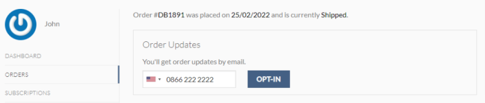 In this example, the SMS opt-in option is enabled and the phone number validation is enabled (only available for Twilio and Nexmo) – The customers entered a valid phone number: