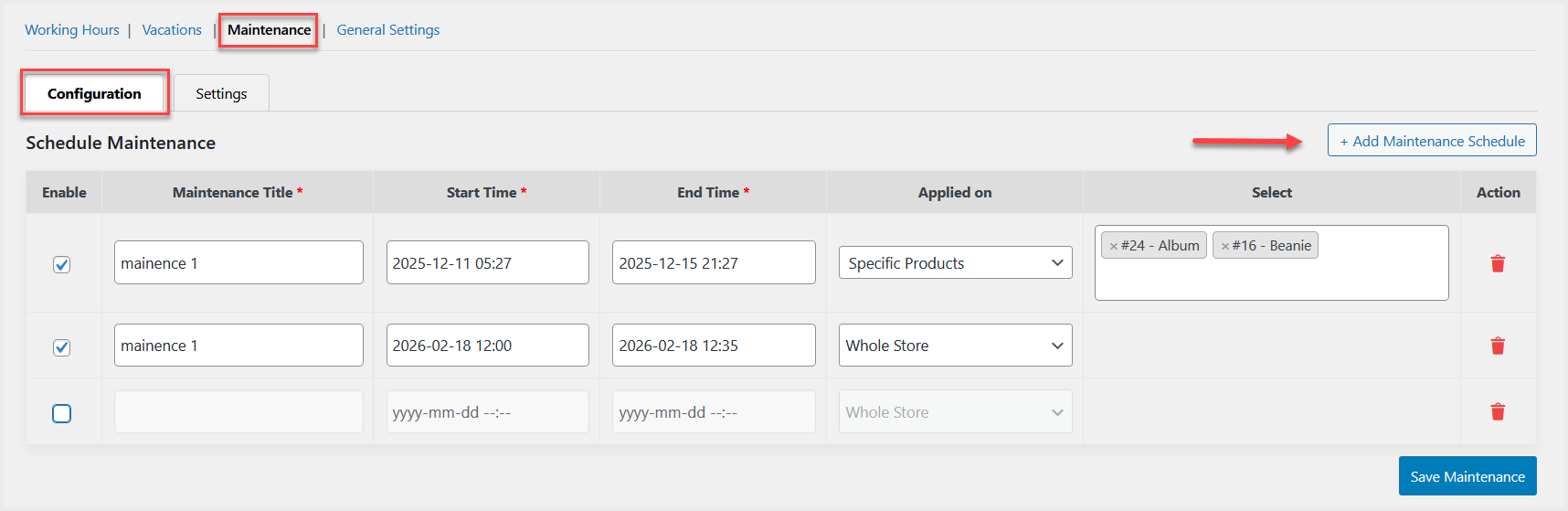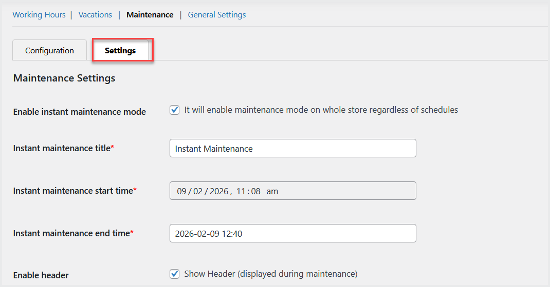 Now click the “Settings” tab, here you can enable instant maintenance mode for the whole store which will be effective right away and you can set its ending date.