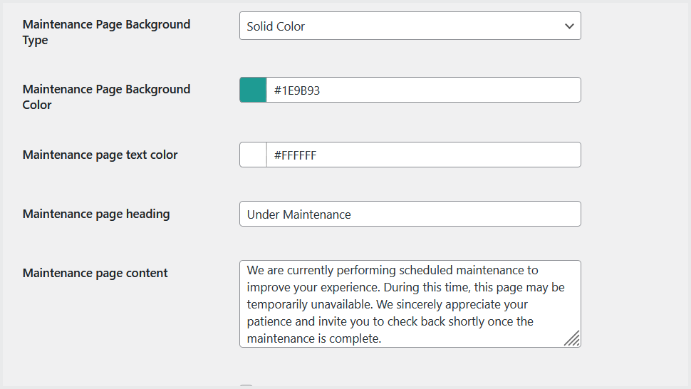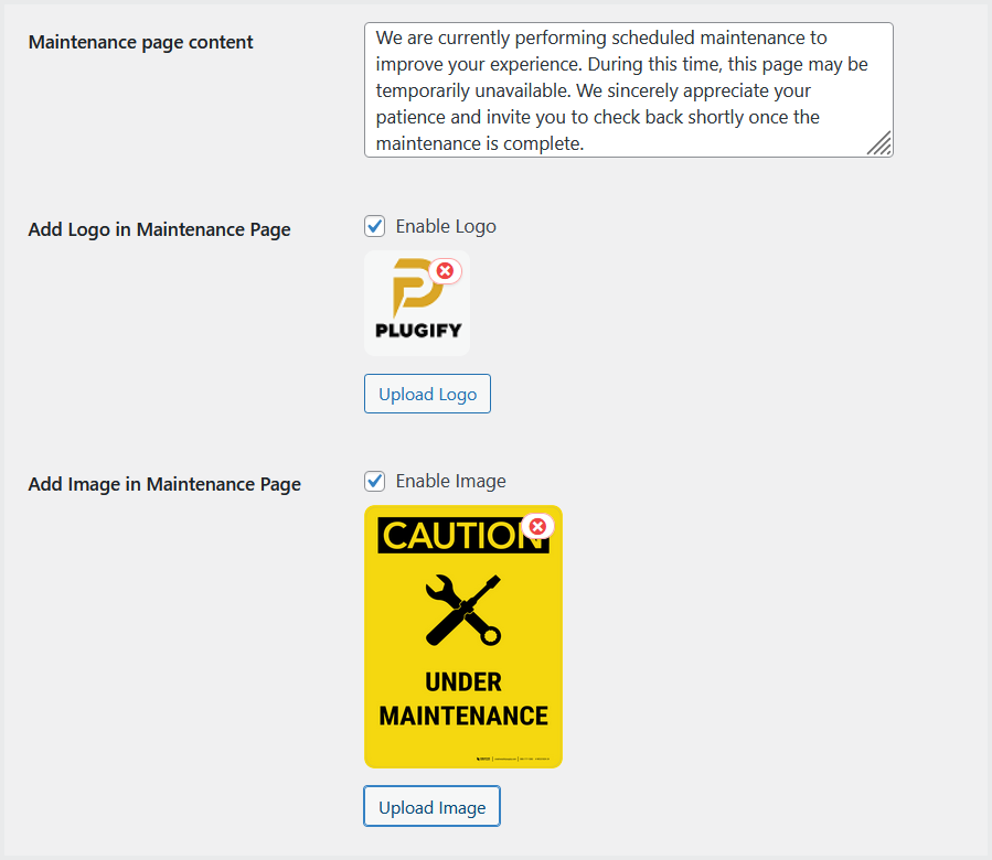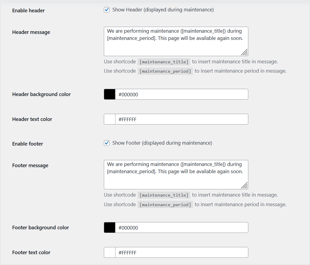 You can enable/disable header and footer to display customized messages during maintenance mode.