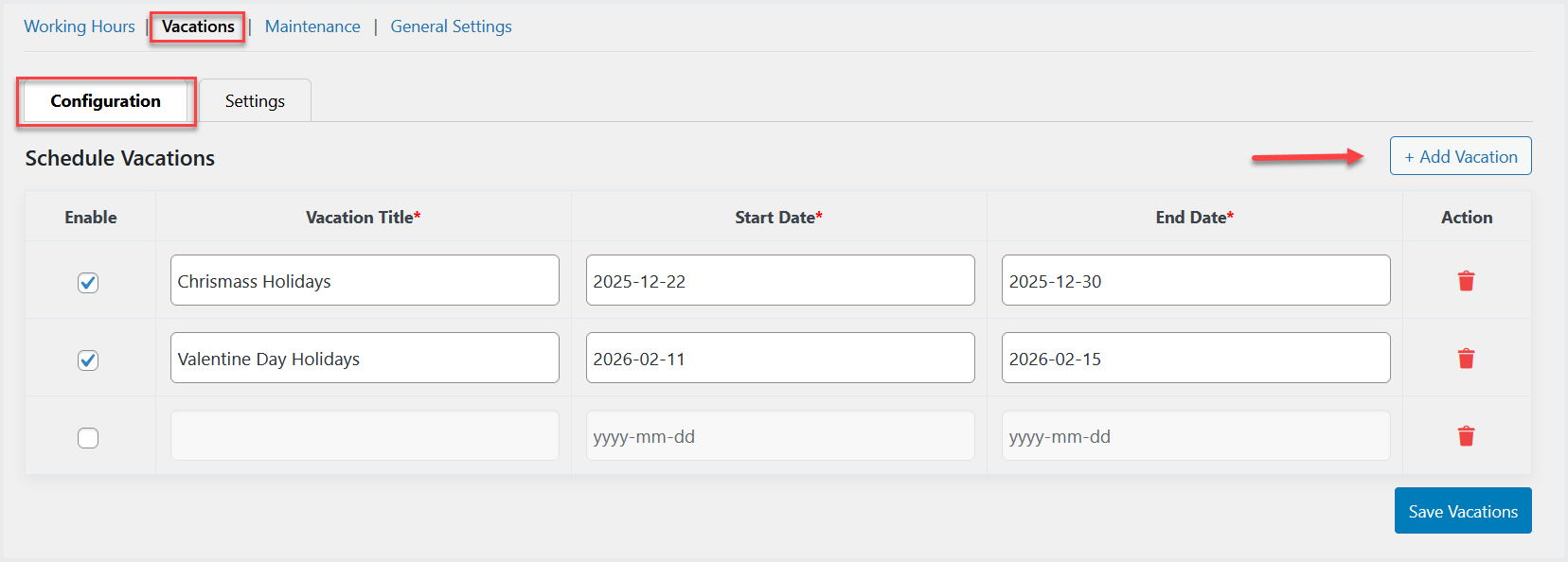 ↑ Back to topClick the “Vacation” tab and visit the “Configuration” tab to add single or multiple vacations based on start and ending dates.