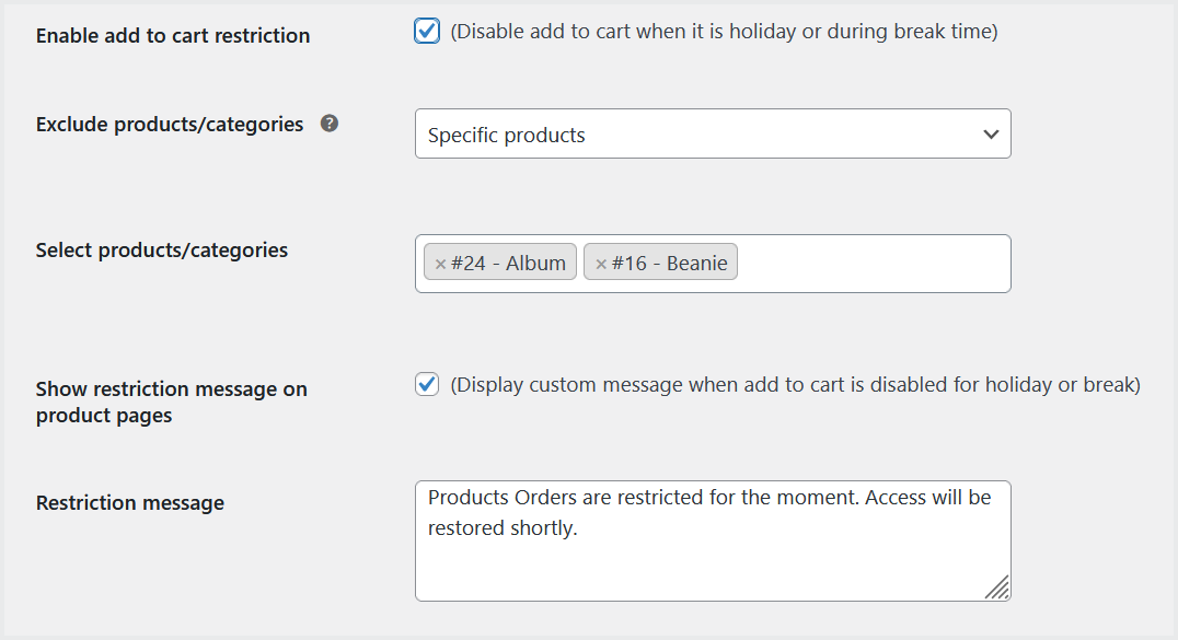 Enable cart restrictions option to disable add to cart button during non-working hours. However, you can also exclude specific products or categories from this restriction.