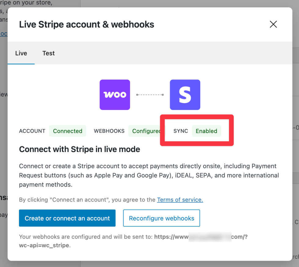If the Sync feature does not show Enabled, you will need to reconnect your site to Stripe’s system.