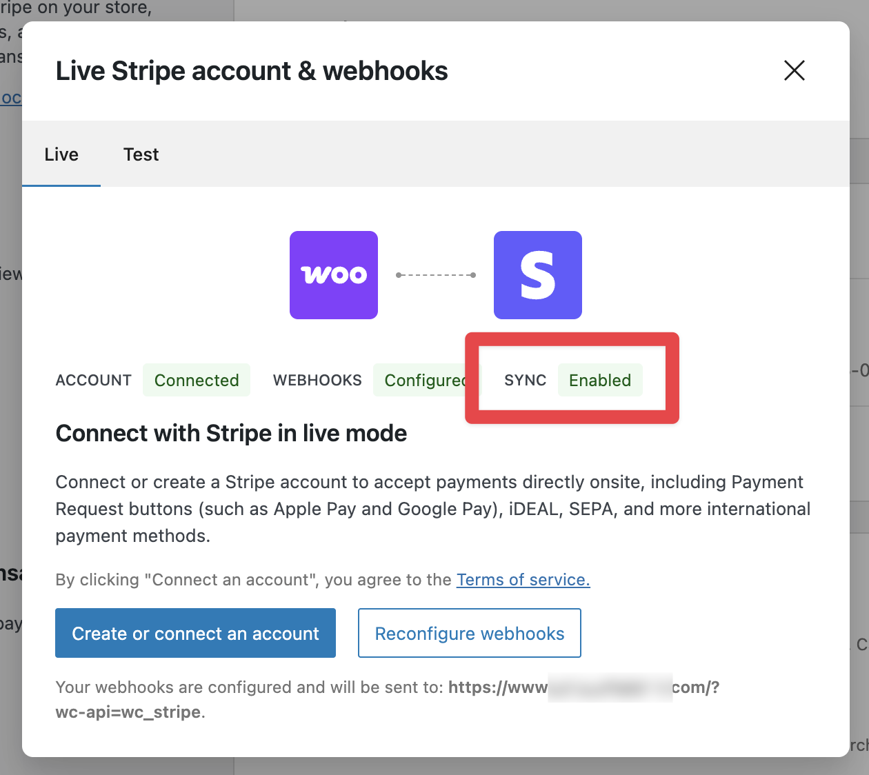 If the Sync feature does not show Enabled, you will need to reconnect your site to Stripe’s system.