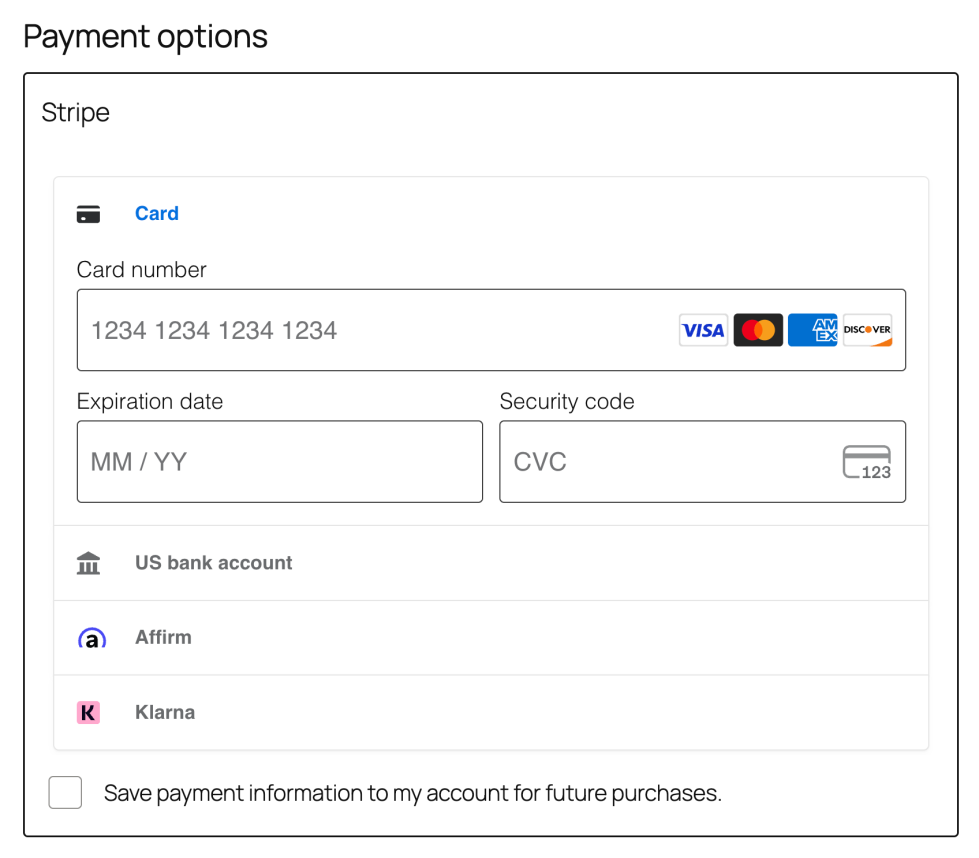 Merchants who use the Stripe extension can also offer additional payment methods to customers. These additional payment methods will be displayed as if they are separate payment gateways, in addition to the usual card payment method.
