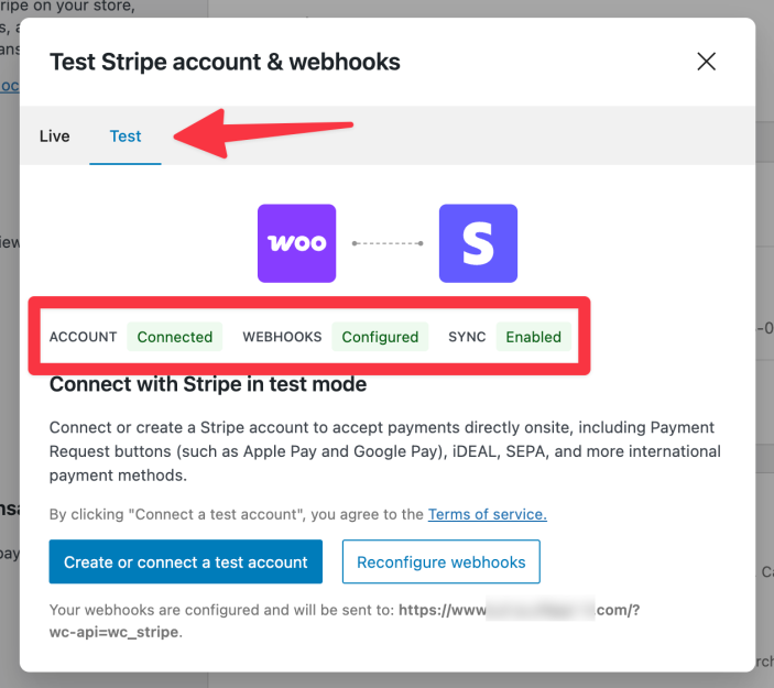- Confirm that the connection to your account’s test mode is working.
