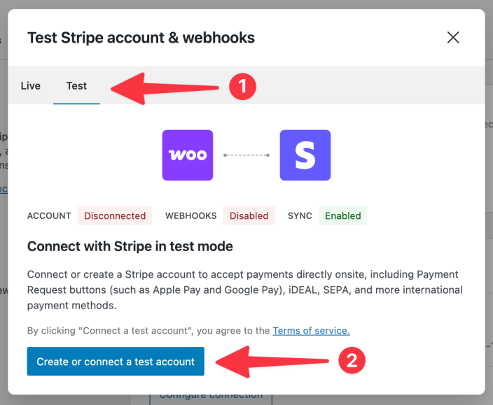 ↑ Back to topWhen you initially connect the Stripe extension to your Stripe account, it only connects in live mode. Connecting to your Stripe account in test mode is a separate process. To connect in test mode: