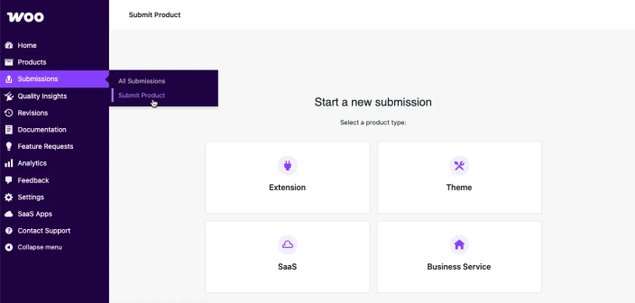 ↑ Back to topFrom your vendor dashboard, navigate to Submissions > Submit Product and select the product type you’re planning to submit: