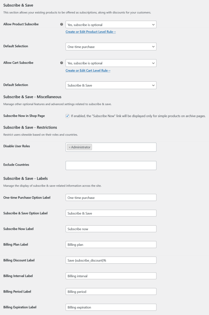 - Navigate to: WooCommerce > Settings > Subscriptions > Subscribe & Save.