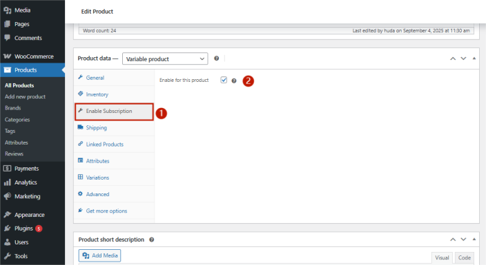- Set Individually – Configure subscription options per product by going to Products > Product Data > Enable Subscription.