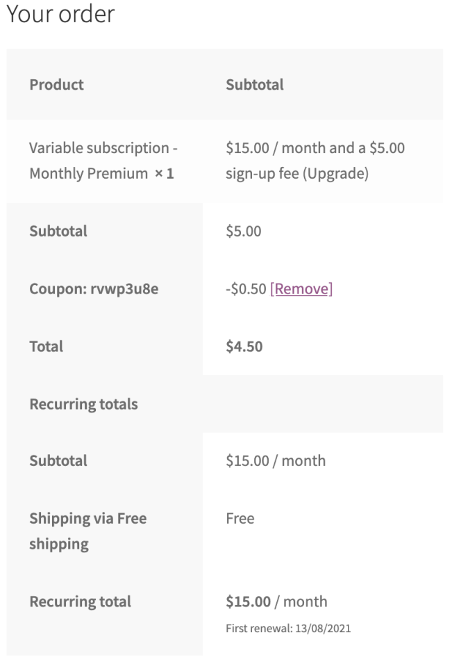 For example, if a subscription to a 3 Widgets/month product was purchased on the 15th July, and on the 1st August a subscriber switches to a 6 Widgets/month subscription, his next renewal payment is charged on the 15th August.