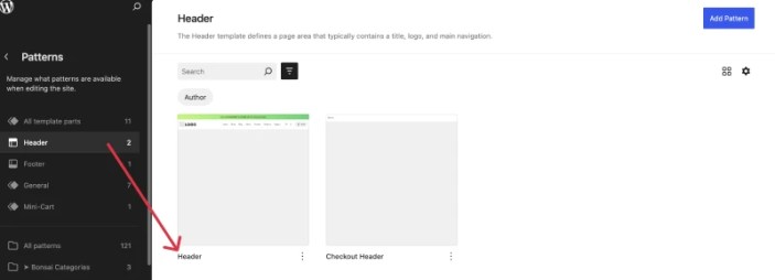 2. In the left sidebar, select Patterns → Header (Template Part).