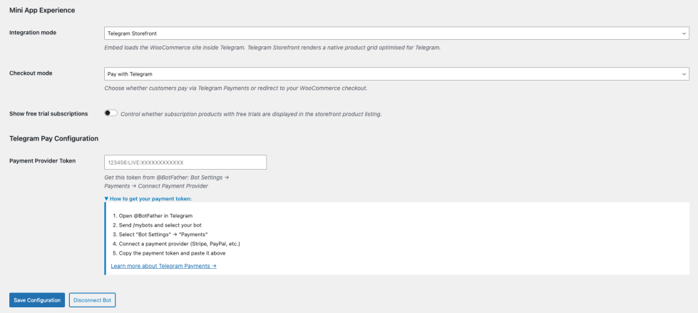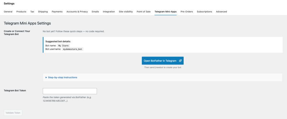 ↑ Back to topAfter activating the plugin, navigate to WooCommerce > Settings > Telegram Mini-Apps. The setup process has two main steps: connecting your Telegram bot and configuring your storefront.