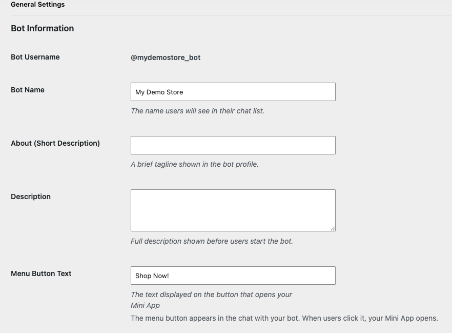 - Menu Button Text: The label on the button that opens your store inside Telegram. The default is “Shop”.