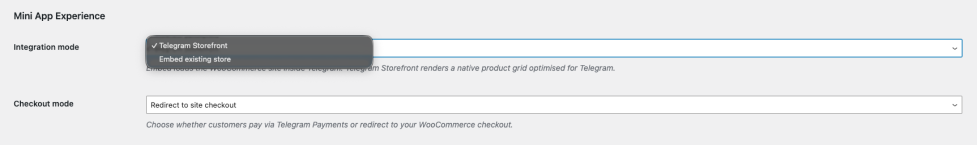 ↑ Back to topThe Integration mode setting controls how your store is presented inside Telegram.