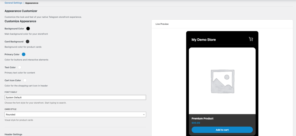 ↑ Back to topWhen using the Telegram Storefront integration mode, an Appearance tab becomes available. This tab lets you customize the look and feel of your Telegram store to match your brand.