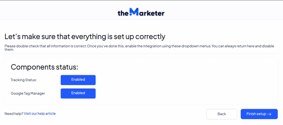 In the second screen, you can set the status of the tracking module and the Google Tag Manager module. By default, both are enabled.