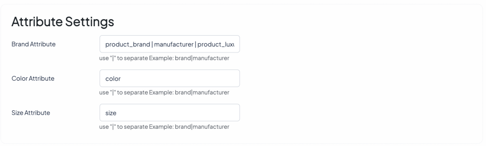 ↑ Back to topFor e-commerce stores where products vary by different criteria, such as size, color etc, in the Attribute Settings section you can map your internal product attributes to the default attributes in theMarketer.