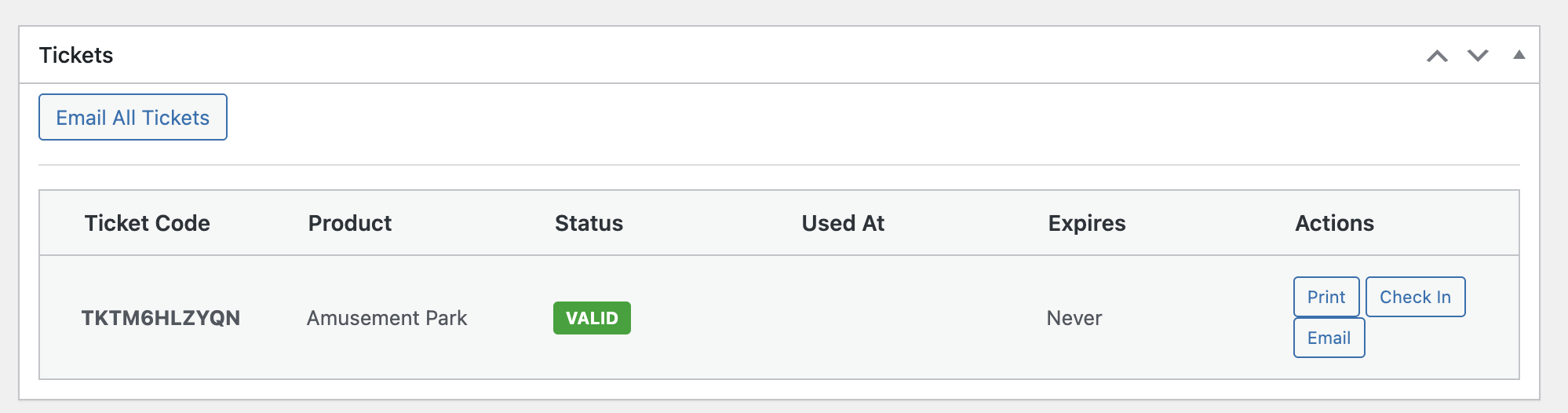 ↑ Back to topWhen viewing an order that contains ticket products a Tickets Metabox appears.