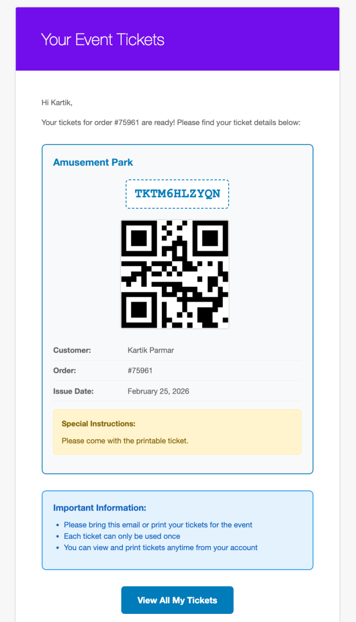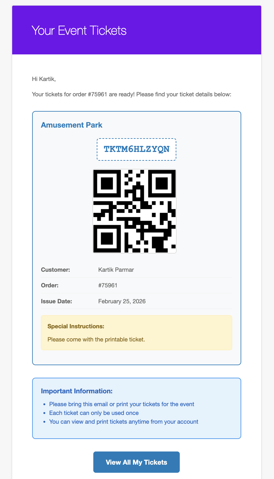 Tickets will now be generated automatically. The customer will receive the ticket email and QR Code inside it.
