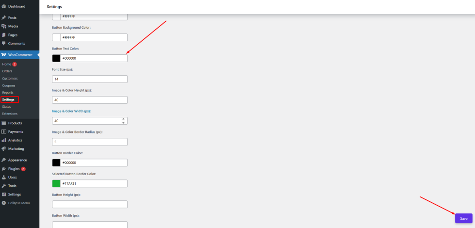 ↑ Back to topThe Button Text Color setting allows you to customize the color of the text displayed inside variation swatches when the attribute display type is set to Button.