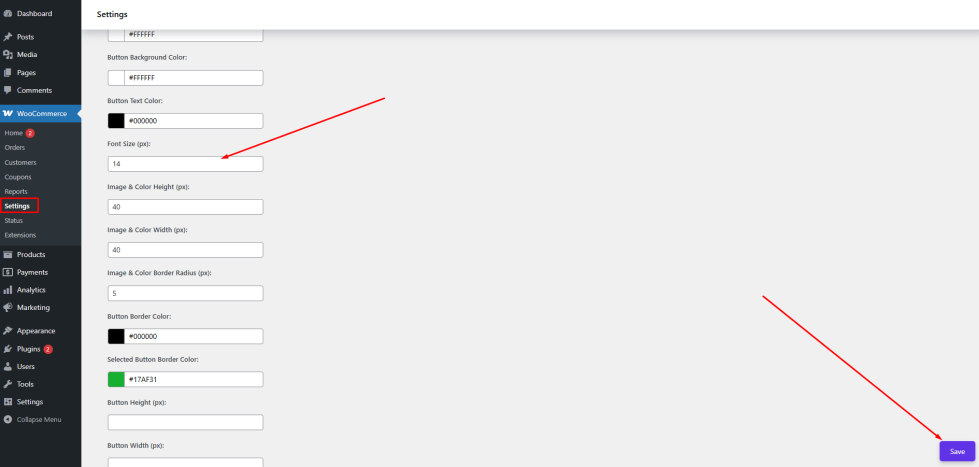 After saving the settings, the updated font size will be applied to all button-type variation swatches on the single product page, ensuring better readability and a consistent appearance.