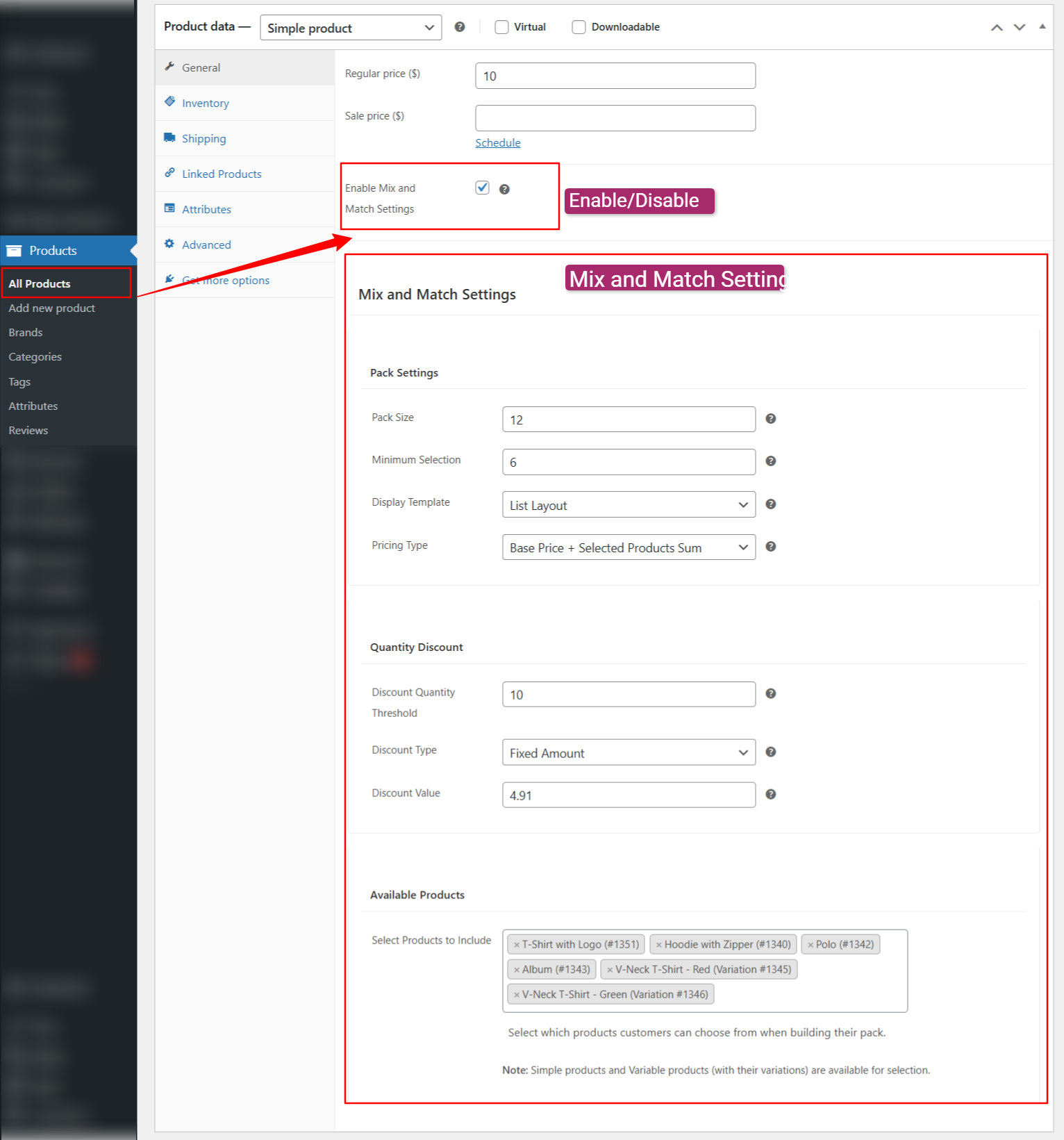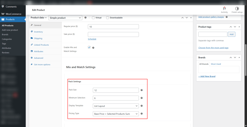 - Under Mix and Match Settings, configure pack size, pricing, allowed products, and discounts.