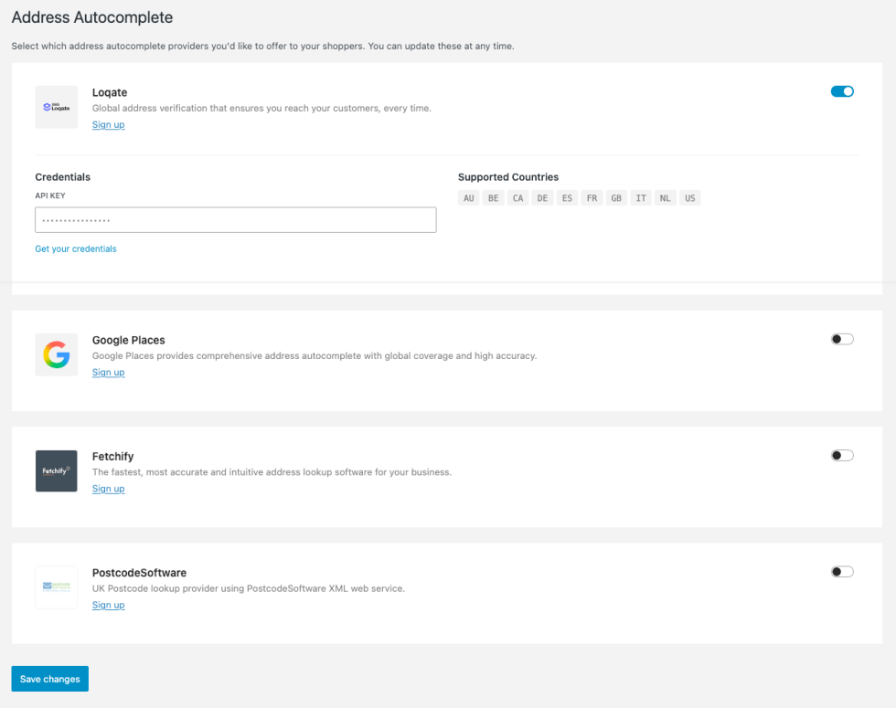 ↑ Back to topTo be able to offer address autocomplete to your customers, you’ll need an account with at least one provider: