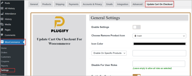 โ Back to topAfter plugin installation, go toย WooCommerce > Settings and click the Update Cart on Checkout tab to configure the settings of this extension.