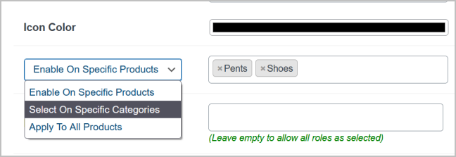 Select theย color of the Remove Product Iconย and select theย products or categoriesย to apply the Remove Product icon. You can also choose to apply theย functionality to the whole store.