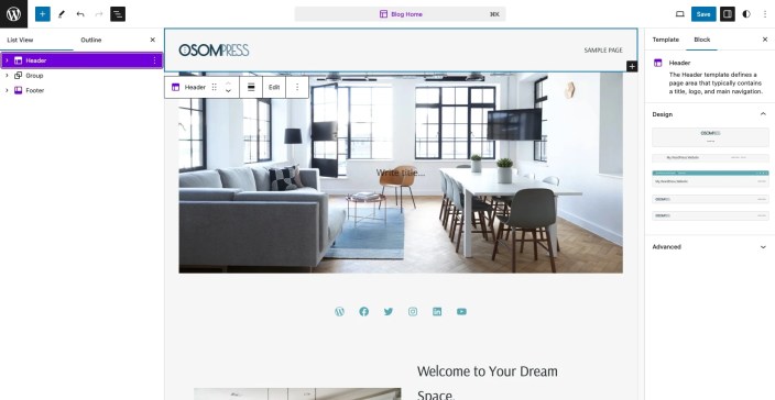 Once you enter the Site Editor, there are several main areas that you can customize: