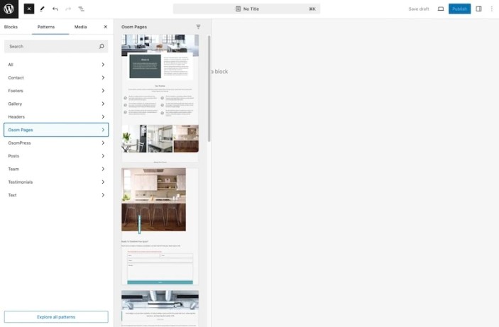 You can introduce all these patterns into any page, post, or template by clicking on the Toggle block inserter + icon and navigating to Patterns > OsomPress section.