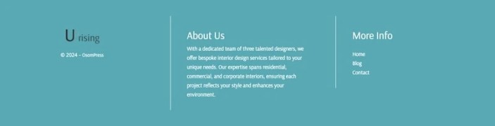 If you want to create a new footer or modify the existing ones in the Uprising Next theme to get your own footer design, get inspired by this step-by-step example: