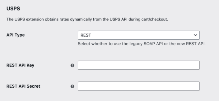 ↑ Back to topNew installations of the USPS Shipping Method default to the REST API connection and the API Type dropdown will be hidden on settings page. Sites that are currently connected via the legacy Web Tools APIs will see the API Type dropdown on the WooCommerce > Settings > Shipping > USPS page. Select the “REST” option and complete the steps below to generate your REST API keys.