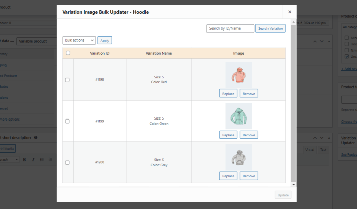 Note: The Variation Image Bulk Updater meta box will be visible only when the variations have been configured.