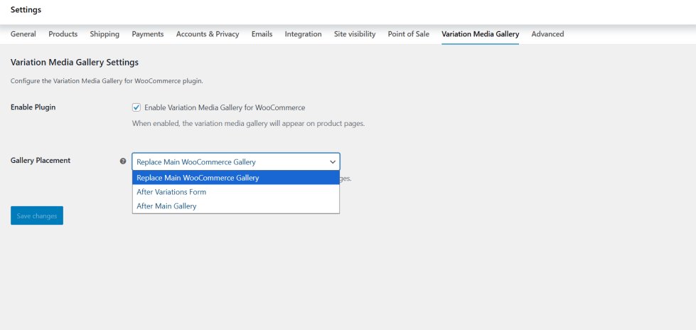- Gallery placement options: choose whereย the gallery appears (replace main gallery, after variations, or after main gallery)
