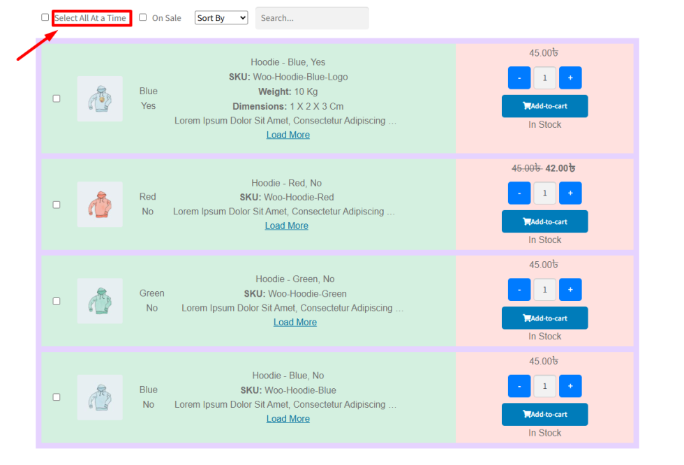 ↑ Back to topWhen customers purchase multiple variations at once, the Bulk Add to Cart section becomes an important part of the table interface.