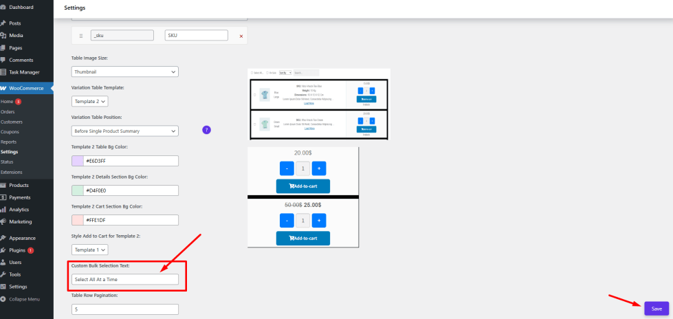- Find the Custom Bulk Section Text for Table Template Two input field.