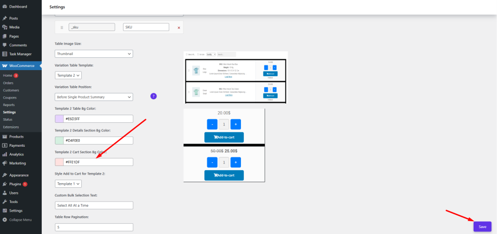 Template Two Table Cart Section Background Color (Pro)