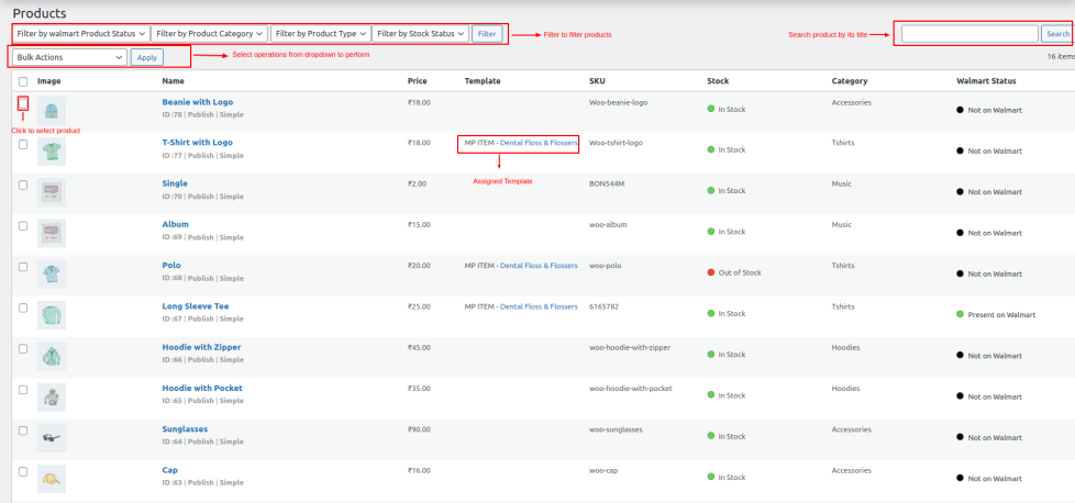 Also you get to view the product image, name, price, template assigned, SKU, stock, Woo category, Walmart Status of the product.