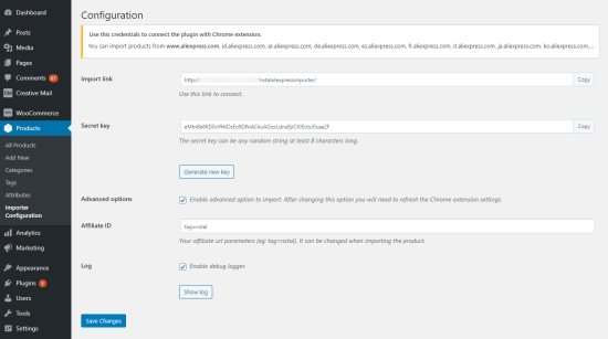 - Copy the Import link and Secret key from the plugin configuration page in your admin panel and paste it into the Chrome extension text box and proceed to connect. If everything works, the extension will connect, and you will see the Import Options in Chrome extension instead of the connection form.