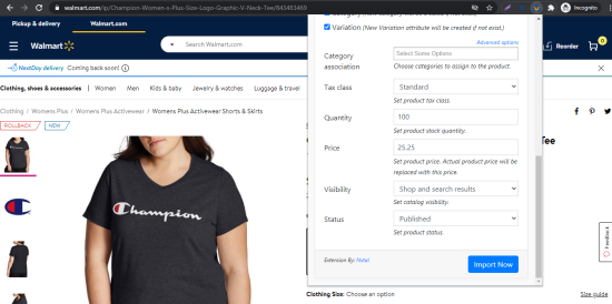 - You need to go to any Walmart product page and click on the Import button visible at the bottom right of the Chrome extension, you can change some properties if necessary. If everything works, you will get the success message and the product will be imported into your WooCommerce.